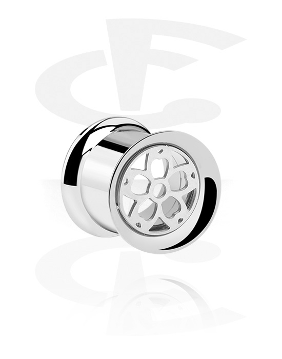 Kaksinkertainen flared-tunneli (kirurginen teräs, hopea, kiiltävä pinta) kanssa kukkadesign