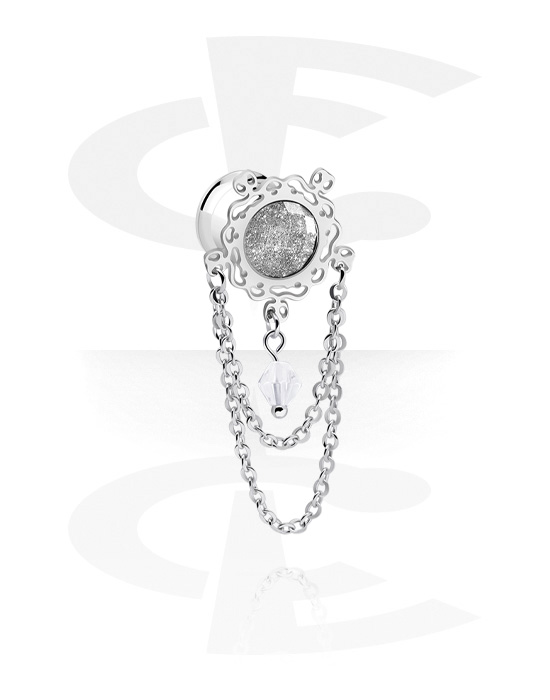 Kaksinkertainen flared-tunneli (kirurginen teräs, hopea, kiiltävä pinta) kanssa kimalleupotus ja ketju