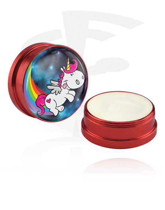 High quality jewelled container in a plug-like look, made of anodised aluminium. Available in various colours and designs. The deodorising conditioning creme takes care of your stretched earlobes and prevents bad smells. After a quick and easy application, the natural ingredients provide optimal skincare and nice smells.