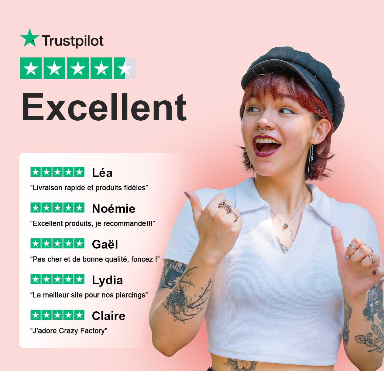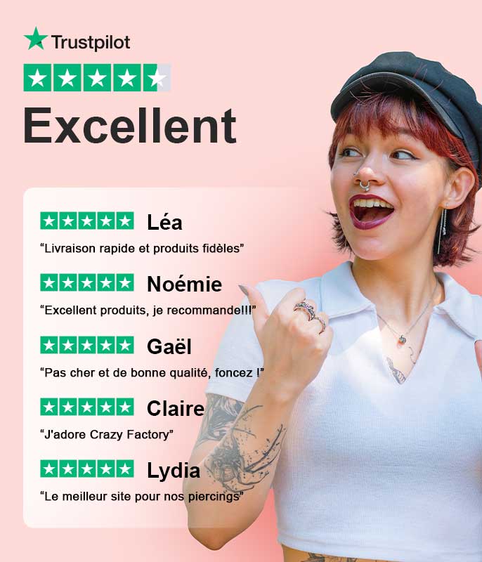 Depuis mon premier piercing, je commande chez Crazy Factory. Avant comme maintenant, ils ont simplement le meilleur rapport qualité-prix et la plus grande gamme pour chaque style.