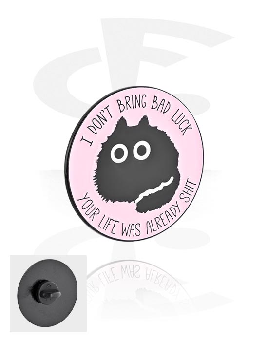 Broche avec Black cat design et lettrage "I don't bring bad luck, your life was already shit"