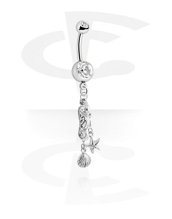 Piercing pour le nombril (acier chirurgical, argent, finition brillante) avec pendentif hippocampe et pierres en cristal