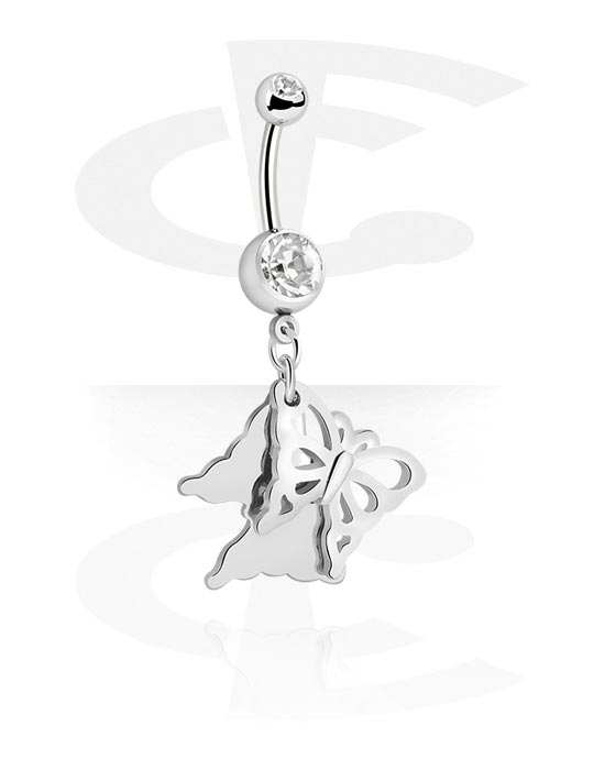 Piercing pour le nombril (acier chirurgical, argent, finition brillante) avec accessoire papillon et pierres en cristal