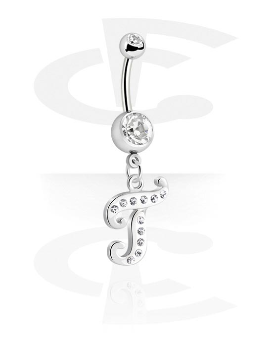 Piercing pour le nombril (acier chirurgical, argent, finition brillante) avec pendentif lettre "T" et pierres en cristal
