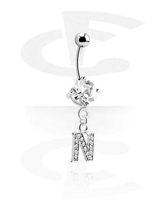 Piercing pour le nombril (acier chirurgical, argent, finition brillante) avec pendentif lettre "N" et pierres en cristal