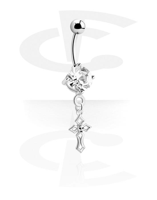 Piercing pour le nombril (acier chirurgical, argent, finition brillante) avec pendentif croix et pierres en cristal