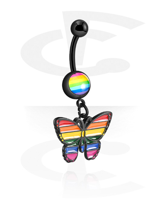 Piercing pour le nombril (acier chirurgical, noir, finition brillante) avec accessoire papillon et couleurs arc-en-ciel