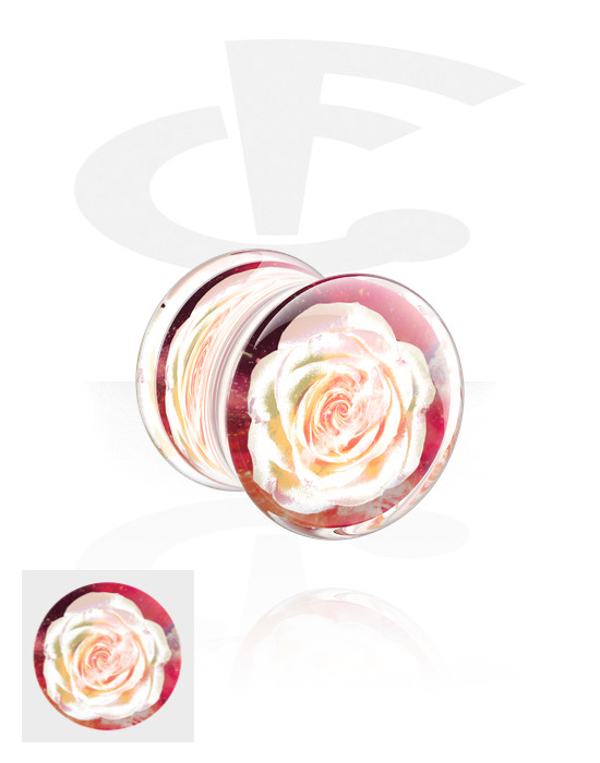 Plug double flared (acrylique, transparent) avec incrustation avec motif rose