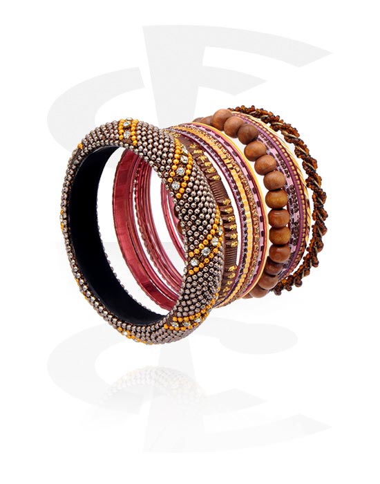This set contains 13 bangles made from wood, glass, resin, plated iron and aluminium. The diameter is 6.7 cm.