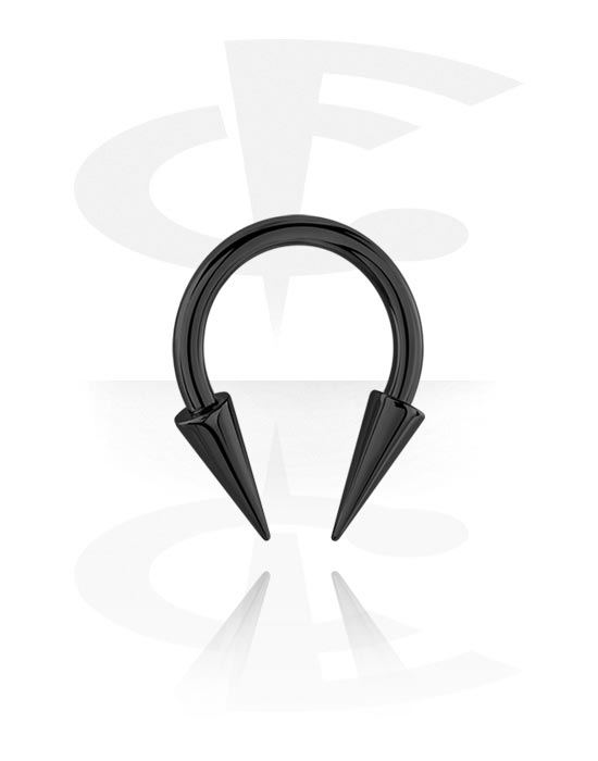 Fekete íves piercing két hosszú, csinos kúppal. Biztosan kihangsúlyozza a kinézeted, egy vagány, sötét csavarral.