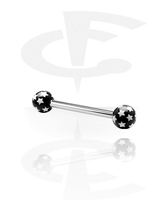 Acél piercing menetes golyókkal, amin pici csillagok vannak mindenhol. Vagány stílus nyelv- vagy fülpiercingnek. Van raktáron szállításra készen, különböző hosszokban és színekben.