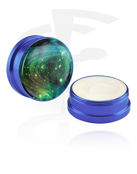 High quality jewelled container in a plug-like look, made of anodised aluminium. Available in various colours and designs. The deodorising conditioning creme takes care of your stretched earlobes and prevents bad smells. After a quick and easy application, the natural ingredients provide optimal skincare and nice smells.