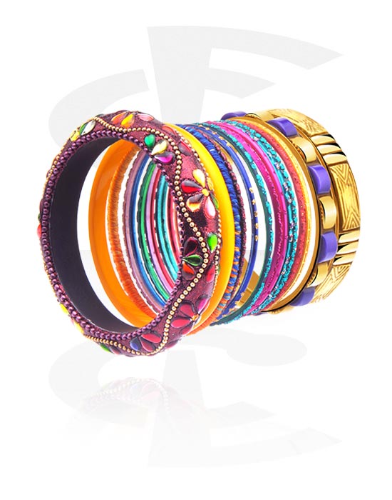 Questo set contiene 14 bracciali di resina,ottone rivestito e alluminio. I bracciali hanno un diametro di 6.7 cm.