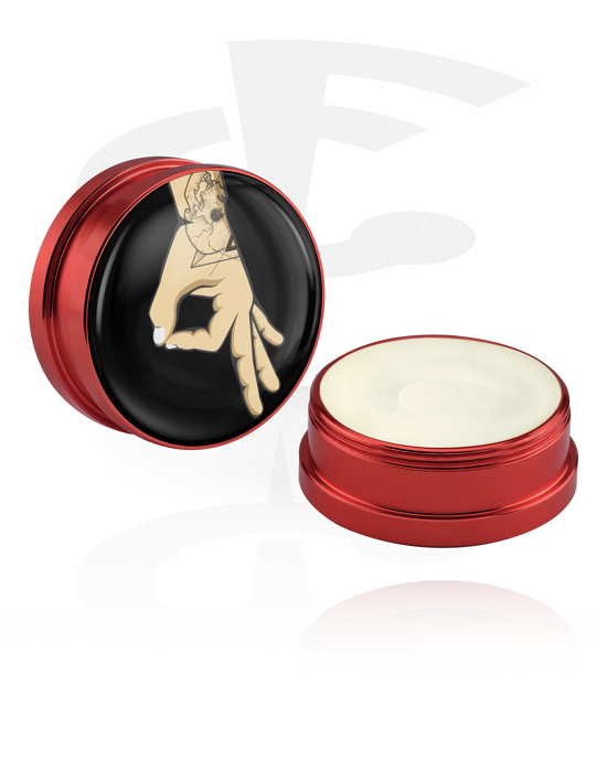 High quality jewelled container in a plug-like look, made of anodised aluminium. Available in various colours and designs. The deodorising conditioning creme takes care of your stretched earlobes and prevents bad smells. After a quick and easy application, the natural ingredients provide optimal skincare and nice smells.