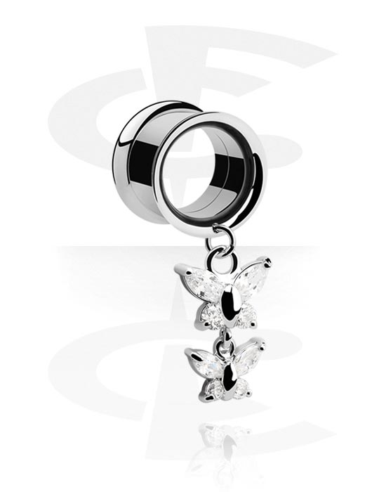 Double flared tunnel (acciaio chirurgico, argento) con ciondolo a farfalla e cristallini