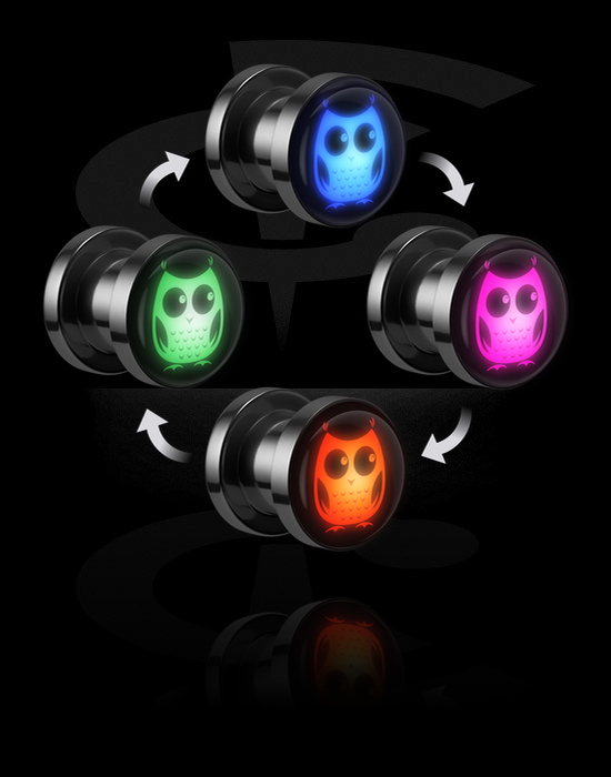Tunnel con filettatura (acciaio chirurgico, argento) con accessorio LED e motivo con gufo