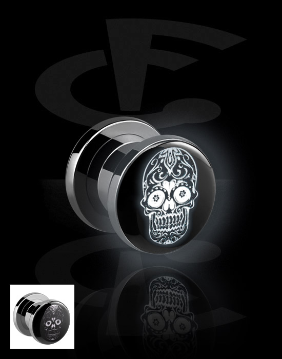 Tunnel con filettatura (acciaio chirurgico, argento) con accessorio LED e design teschio in bianco e nero "dia de los muertos"