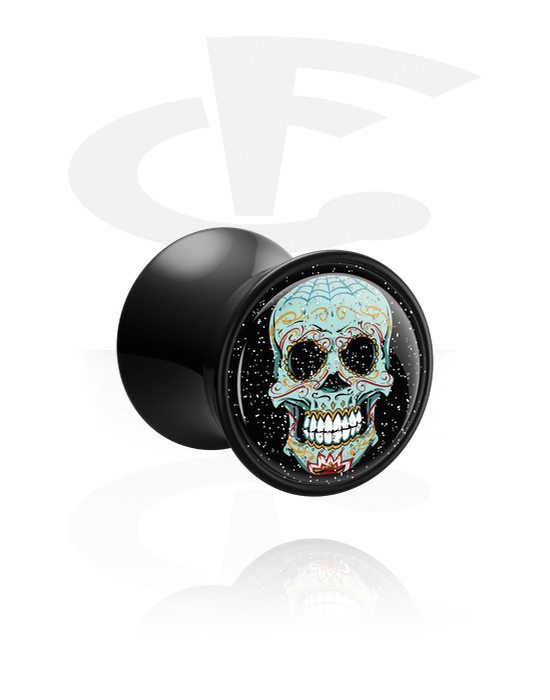 Double flared plug (acrilico, nero) con design teschio colorato "dia de los muertos"