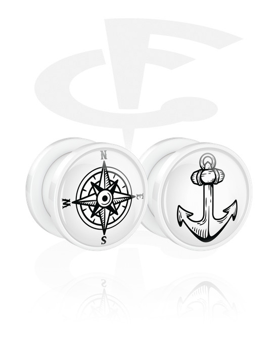 Un paio di tunnel con filettatura (acrilico, bianco) con design "ancora e bussola"