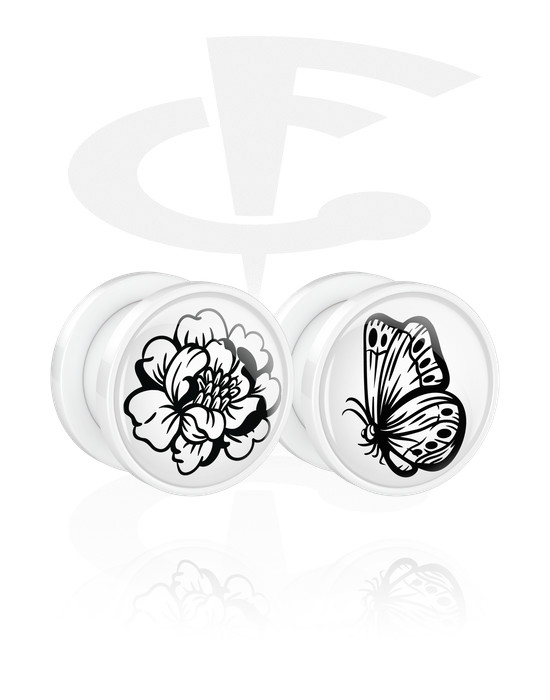 Un paio di tunnel con filettatura (acrilico, bianco) con motivo "fiore e farfalla"