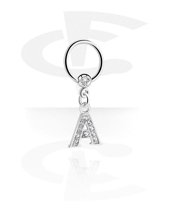 Ball closure ring (acciaio chirurgico, argento, finitura lucida) con brillantino e ciondolo con lettera "a"