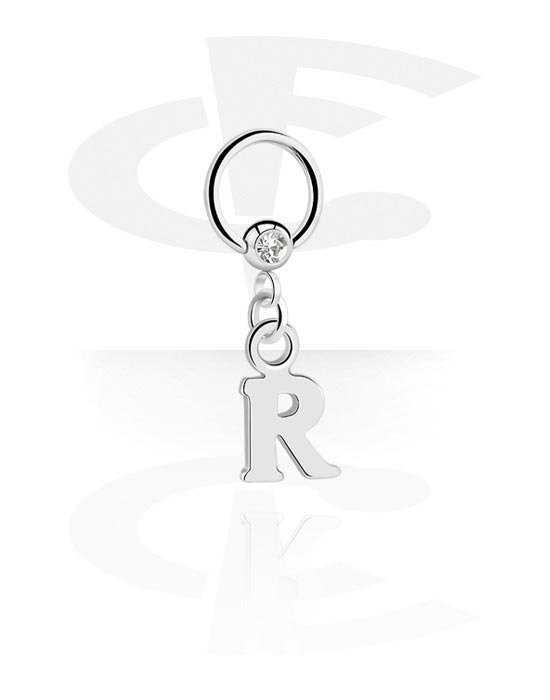 Ball closure ring (acciaio chirurgico, argento, finitura lucida) con brillantino e ciondolo con lettera"r"