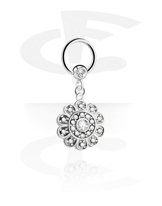 Ball closure ring (acciaio chirurgico, argento, finitura lucida) con ciondolo con fiore e cristallini