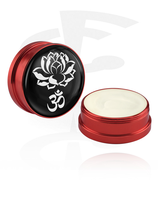 High quality jewelled container in a plug-like look, made of anodised aluminium. Available in various colours and designs. The deodorising conditioning creme takes care of your stretched earlobes and prevents bad smells. After a quick and easy application, the natural ingredients provide optimal skincare and nice smells.