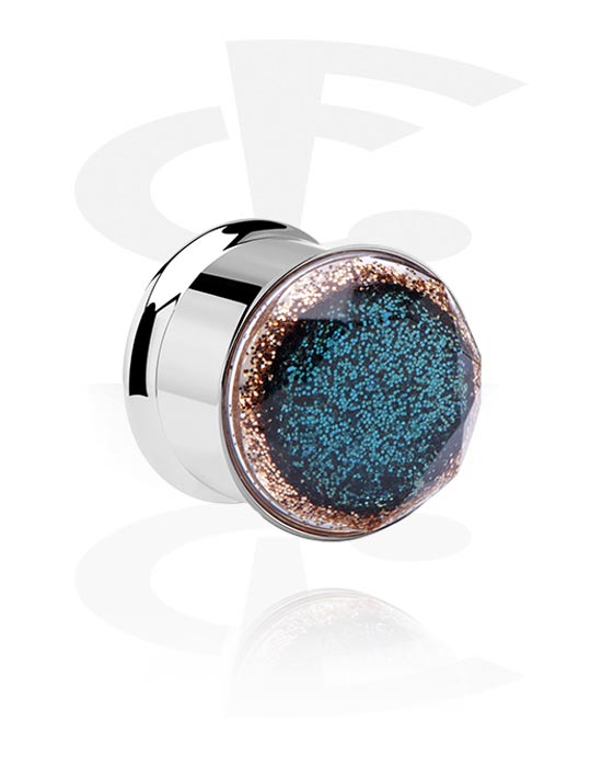 Dobbeltformet tunnel (kirurgisk stål, sølv, skinnende finish) med fargerik hette og glitter