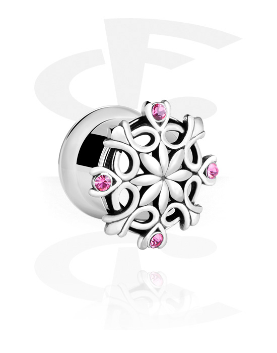 Dobbeltformet tunnel (kirurgisk stål, sølv, skinnende finish) med blomsterdesign og krystallsteiner
