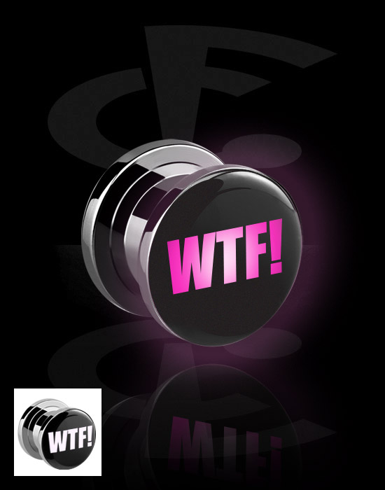 Skrutunnel (kirurgisk stål, svart, skinnende finish) med LED-feste og "WTF!" skrift