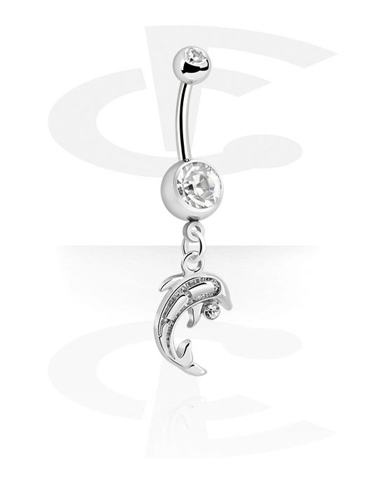 Navlering (kirurgisk stål, sølv, skinnende finish) med delfincharm og krystallsteiner
