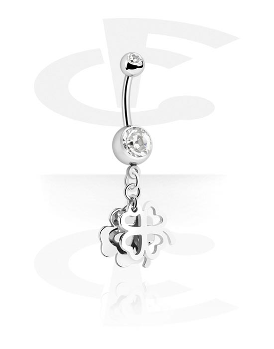 Navlering (kirurgisk stål, sølv, skinnende finish) med kløverbladcharm og krystallsteiner