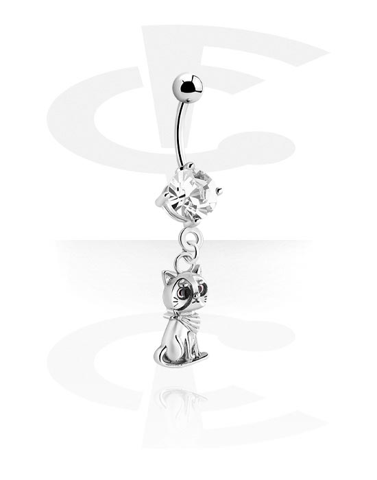 Navlering (kirurgisk stål, sølv, skinnende finish) med kattecharm og krystallsteiner
