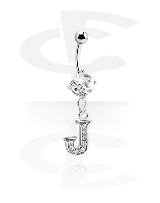 Navlering (kirurgisk stål, sølv, skinnende finish) med charm med bokstaven "J" og krystallsteiner