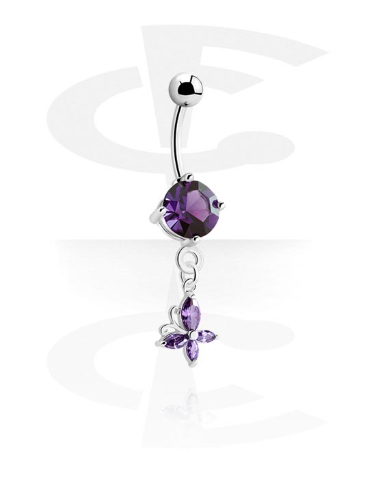 Navlering (kirurgisk stål, sølv, skinnende finish) med sommerfuglcharm og krystallsteiner