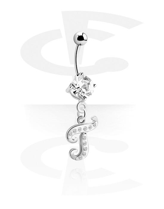 Navlering (kirurgisk stål, sølv, skinnende finish) med charm med bokstaven "T" og krystallsteiner