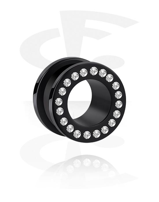 Deze flesh tunnel van zwart acryl wordt gecomplementeerd door prachtig fonkelende kristalsteentjes en is tegelijkertijd simpel, klassiek en edel.