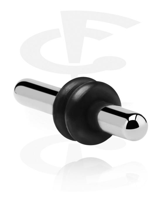 De langwerpige plug is gemaakt van hoogwaardig chirurgisch staal en heeft twee zwarte rubberen ringetjes als stoppers.