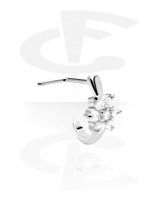 Haczyk do nosa (stal chirurgiczna, srebro, błyszczące wykończenie) z nakrętką w kwiaty i kryształami