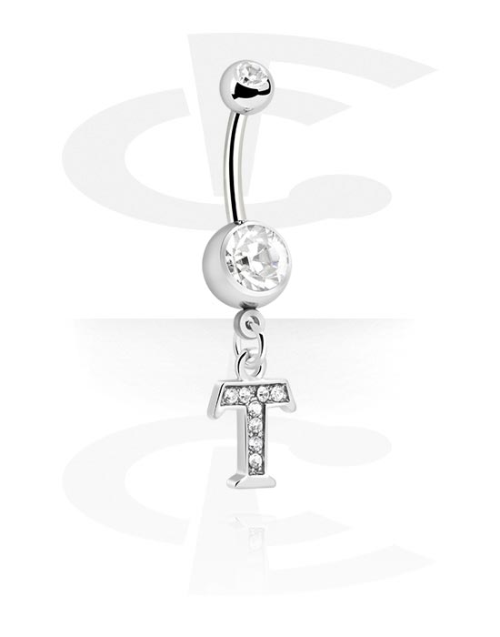 Kolczyk do pępka (stal chirurgiczna, srebro, błyszczące wykończenie) z charmsem z literą „T” i kryształami