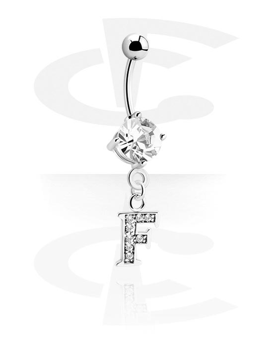 Kolczyk do pępka (stal chirurgiczna, srebro, błyszczące wykończenie) z charmsem z literą „F” i kryształami