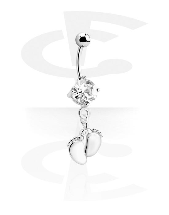 Kolczyk do pępka (stal chirurgiczna, srebro, błyszczące wykończenie) z charmsem stopą i kryształami