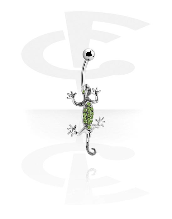 Kolczyk do pępka (stal chirurgiczna, srebro, błyszczące wykończenie) z nakrętką gekonem i kryształami