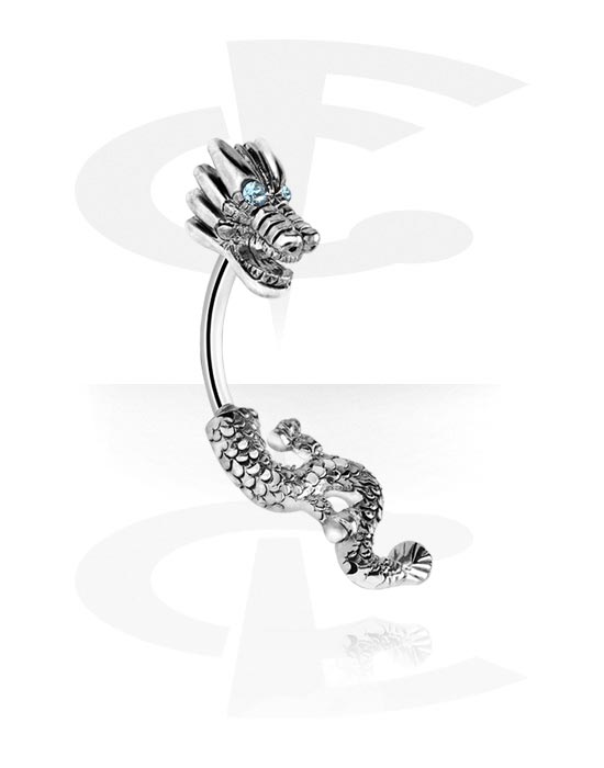 Kolczyk do pępka (stal chirurgiczna, srebro, błyszczące wykończenie) z wzorem smoka i kryształami