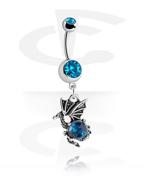 Kolczyk do pępka (stal chirurgiczna, srebro, błyszczące wykończenie) z charmsem smokiem i kryształami