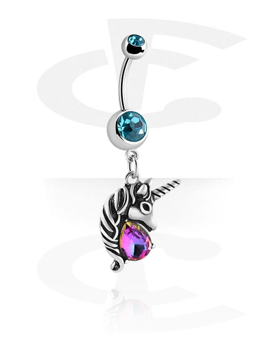 Kolczyk do pępka (stal chirurgiczna, srebro, błyszczące wykończenie) z wzorem jednorożca i kryształami