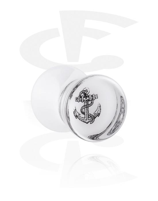 Black double flared plug made of acrylic, featuring a classic white anchor design on a flat face.