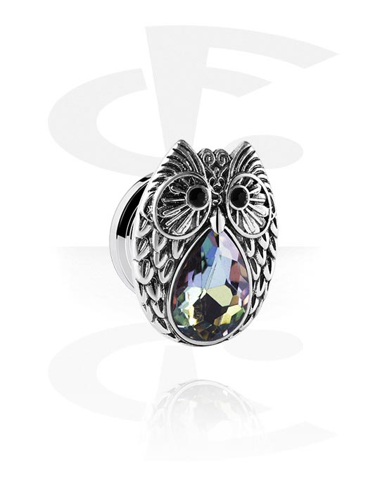 Tunel z odkręcaną ścianką (stal chirurgiczna, srebro, błyszczące wykończenie) z wzorem sowy i z kryształem