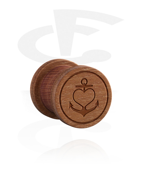 Handcrafted ribbed plug made of wood, featuring a heart and anchor engraving in a romantic retro style. With all products made of organic materials, size, shape and colour may vary slightly.